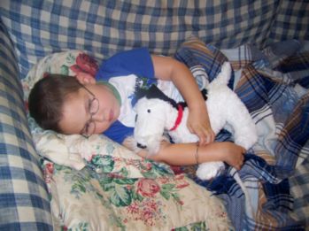 ![]() Caleb spends a lot of time on the couch these days, just watching TV, a movie, or with his family. Here, he's cuddling with Ike. This was a gift from his friends Ms. Patty and Mr. Al. |