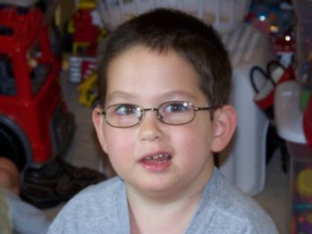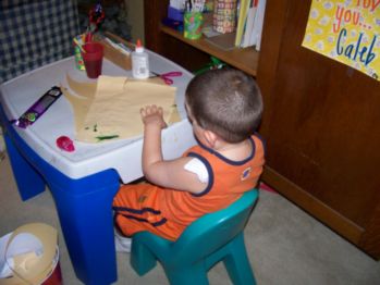 ![]() Caleb, working on art projects at his table. This is something else that he can still do fairly well. He enjoys making pictures for Mom & Dad. |