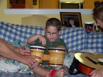![]() Caleb plays the bongo drums while his friend Ms. Kim plays the guitar! The bongo drums were a gift from Ms. Kim and he loves them. |