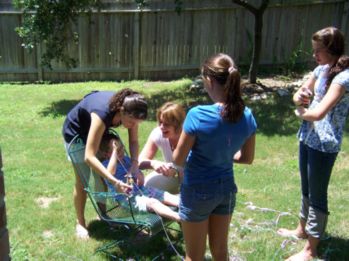 ![]() Caleb, Aunt Yvonne, and his cousins play silly string with him in Aunt Yvonne's yard! He got everyone good. |