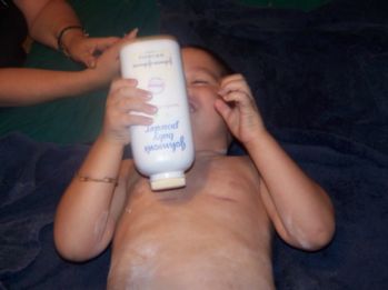 ![]() Caleb thinks it's just hilarious to take a bottle of powder and dump it all over himself until the room is full of powder. He just laughs. It's cheap, and we're definitely into simple pleasures. |