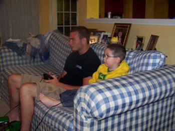 ![]() Caleb and his brother, playing X-Box racing games. Notice how serious they are! |