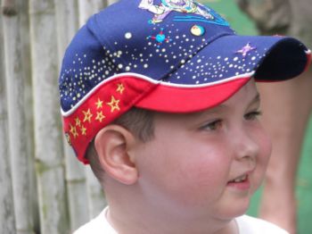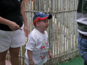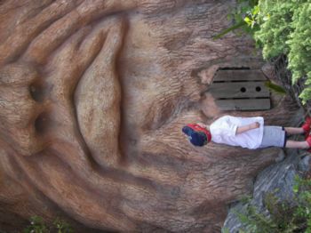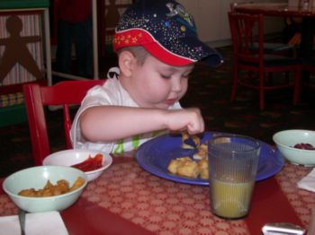 | The food here is positively stupendous! Breakfast is the main meal we eat here; it's wonderfully prepared and very scrumptious! You can see how much Caleb is enjoying it. | Caleb, by the talking tree! Sorry, this is another one of those pictures you have to tilt your head to the left for. The tree snores! Caleb was a bit frightened. | Caleb inside the Castle of Miracles. He was given a nice star (which he's holding). He placed his name on it, put it in the miracle chest, and the Star Fairy took it before his very eyes! The next day, we found it mounted on the ceiling along with the stars of all the other Children who have been here. His star will remain forever. |