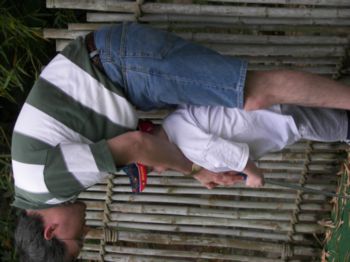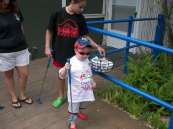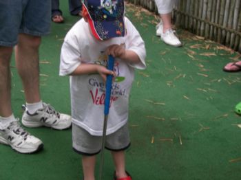 | Here's Caleb after making his shot. | Turn the head to the left ... here's Dad, showing Caleb proper form for putting. | "What the heck!!! I was robbed!!! I can't believe that! What an awful shot!" |