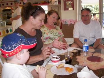 | Caleb, putting yet again. | Caleb, cracking a smile as the dinosaur squirts water all over Dad when he sinks a putt. This is quite an interesting golf course. | We enjoyed a nice lunch in the Ice Cream Palace with Uncle Bob and Aunt Pam. |