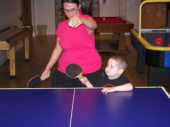 | Caleb posing on the Golf Course. | Caleb and Big Sister versus Dad in ping pong. Caleb enjoyed this game, too. | Caleb poses with Mayor Clayton. |