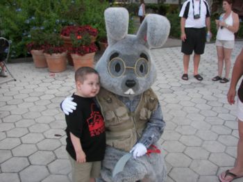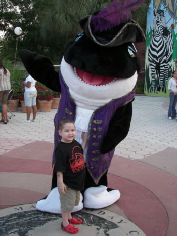 | Caleb poses with Shamu. The good folks at Sea World sent Shamu over to GKTW. Here, Shamu is wearing a Pirate costume! | . |
