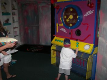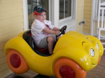 | Caleb, making pillows using the magic pillow making machine inside the Castle of Miracles. He made two really nice pillows for himself! | Yet again, Caleb enjoys playing on the moving car! This car was quite energetic - upon being engaged, it looks a bit like a bull riding ride versus a child's car! Caleb loves it. | Caleb discovered that he LOVES playing golf! This is Caleb and his cousin Marissa, heading out onto the miniature golf course. We played, and played, and played for hours. |