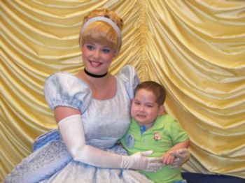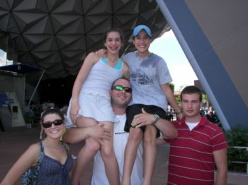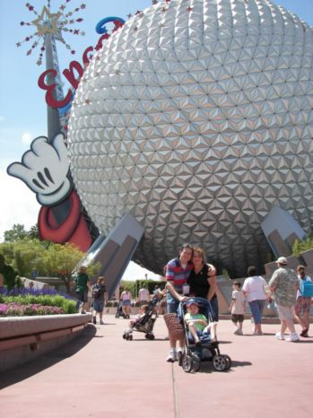 | Caleb poses with Alice in Wonderland; she made a surprise visit to Give Kids the World this morning. | Big sister carrying the weight of the world! | Mom, Dad, and Caleb pose with the Epcot "Spaceship Earth." |