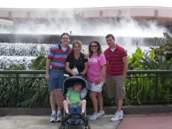 | The cousins pose. L-R is Victoria, Julianna, Robert, Marissa, and Christopher. Only Caleb & Natashia are missing. | The family in front of the EPCOT fountain. Caleb was heading towards his morning nap, if you can't tell! | We again met the characters at the EPCOT Character Connection. Disney did something special for Caleb; they cleared the floor of the many, many young fans and all the characters swarmed Caleb. It was very special for Caleb. He asked to get up out of his stroller to hug them (a rare request) |