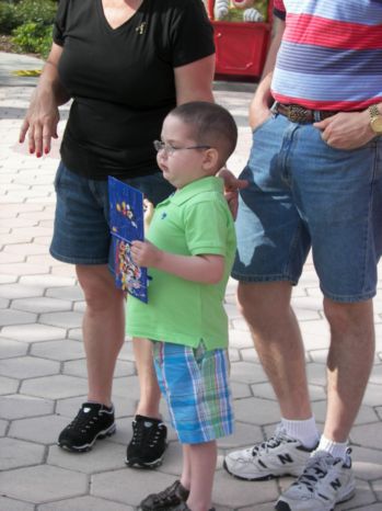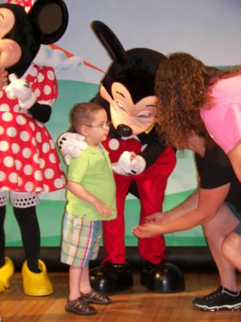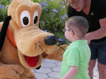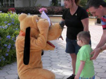 | The whole family poses for a pic with Mickey and Minnie at the Give Kids the World resort. | Mickey loves on Caleb for a little while - I think the picture stretched out a bit, sorry! | Caleb waits very patiently with his autograph book for a photo opportunity and autograph with Pluto! |