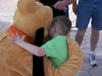 | "Hi Pluto, I'm Caleb! I watch you everyday! I love you! Will you sign my book?" --- it was so awesome, we loved it.. | Pluto autographs Caleb's book. Apparently, Pluto needs to visit his optician for an update to his eyeglasses prescription! I wonder if Mickey carries insurance on him? | Caleb loving on Pluto. Caleb was so affectionate with all the characters. Not scared at all, really loving to them. As I said somewhere else, all responded well to him and some were genuinely moved. |