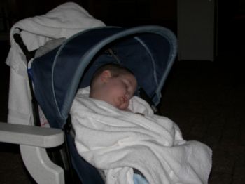 | Caleb, with Mom this time, in the Carribean Beach Resort pool. | A little bit after swimming ... Caleb had a LONG day. | . |
