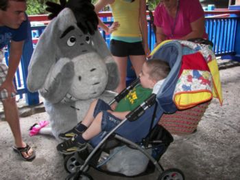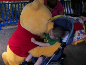 | Caleb meets Winnie the Pooh!!! "I love you, Winnie". | Not to leave out Eyore (how do you spell that ??) Caleb was really getting into the autographs by this point. | Another example of a Disney Character who really loved all over Caleb, and moved us all. Tigger did a great job with Caleb, and as you can see, Caleb responded to him |
