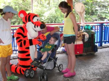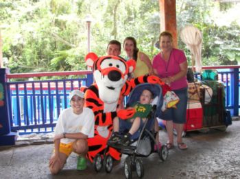| Everyone wanted to pose with Tigger!!! | Later in the day, we met Lilo and Stitch. They loved all over Caleb, too. Here's the group picture with Caleb, cousins Marissa and Julianna, and big sister Natashia. | Caleb swims in the pool at the Carribean Beach Resort with his cousin, Marissa. He LOVES to swim! His goal is now to swim without his floaties. |