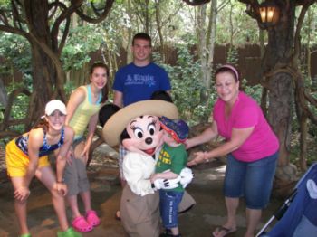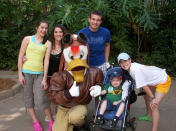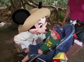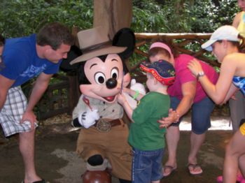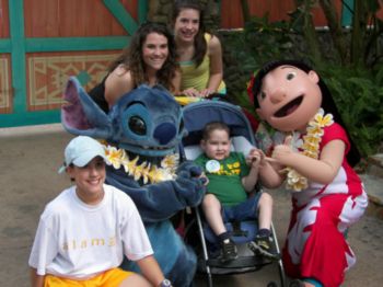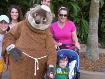 | Chip and Dale were absolutely awesome! They worked so well together doting on Caleb. Truly a fun time. | Of course, Caleb couldn't possibly pass up a picture with Stanley! Here, Stanley poses with the whole clan. | Caleb has not gotten up much and wanted to walk ... but when he got to meet Mickey, he about sprung out of the stroller to get to him! Mom tries to stead him, here. He is so proud of his autograph book! |