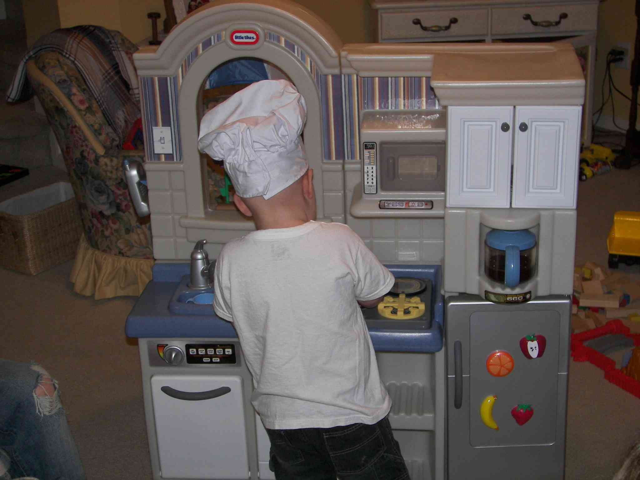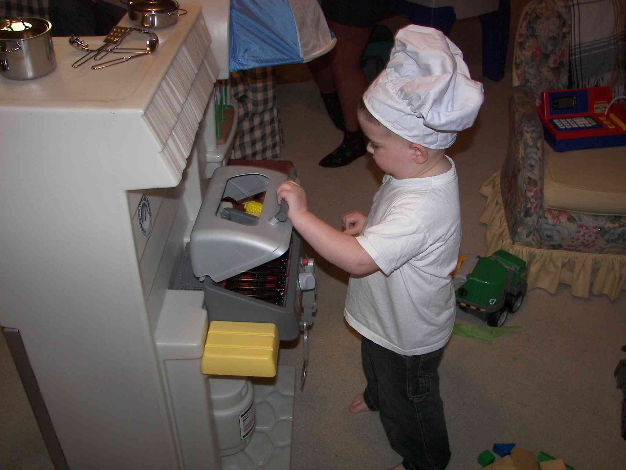 ![]() Caleb grills on his new kitchen set. The backside is a backyard mockup with a very real looking BBQ grill! |