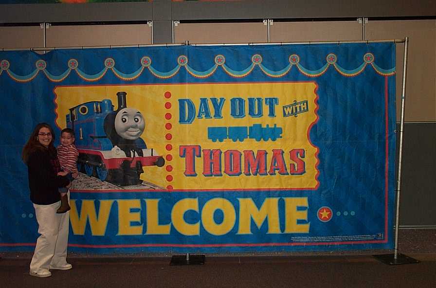 Caleb and big sister at the "Day Out with Thomas" welcome banner. |