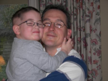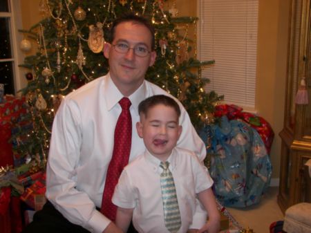![]() Caleb and Dad pose for Christmas Eve pictures. Caleb was in a playful mood, as the picture shows. |