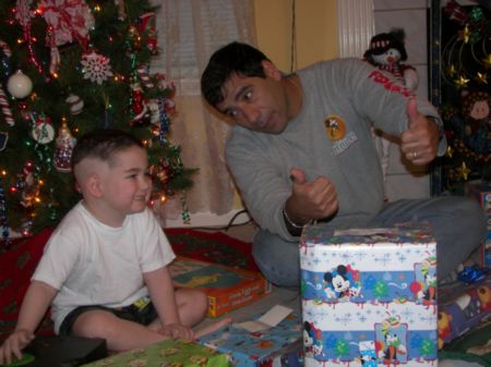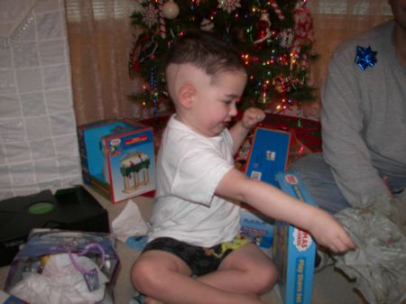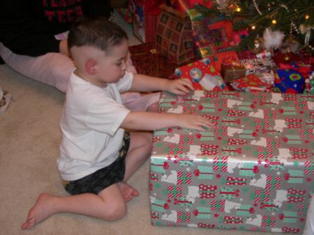 ![]() Uncle Jorge helps Caleb open gifts on Christmas morning. |