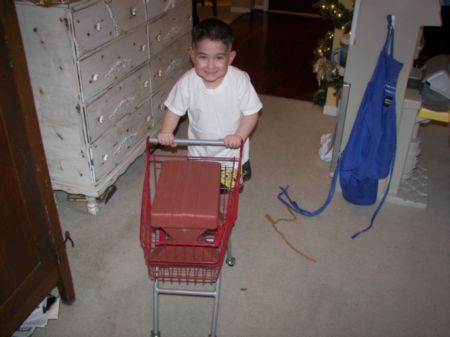 ![]() A shopping cart from his big sister!!! In case you didn't know, he runs his own store where he sells Mom & Dad (or any other customer) unique toys. |