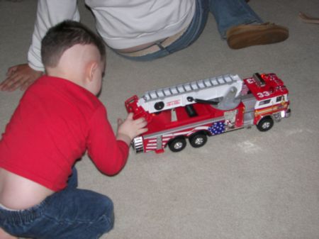 ![]() Caleb playing with one of his fire truck gifts. I think he has a large fleet of fire trucks now - but he plays with each one of them! |